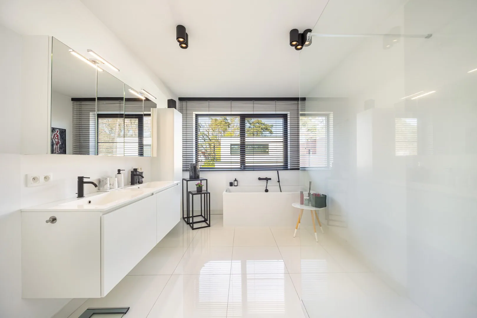 De badkamer is stijlvol ingericht en voorzien van een moderne inloopdouche. Alles is tot in de puntjes afgewerkt waardoor u zonder zorgen kan intrekken.